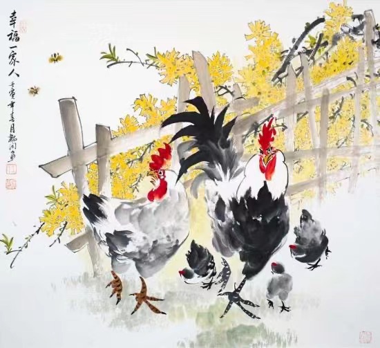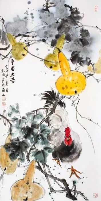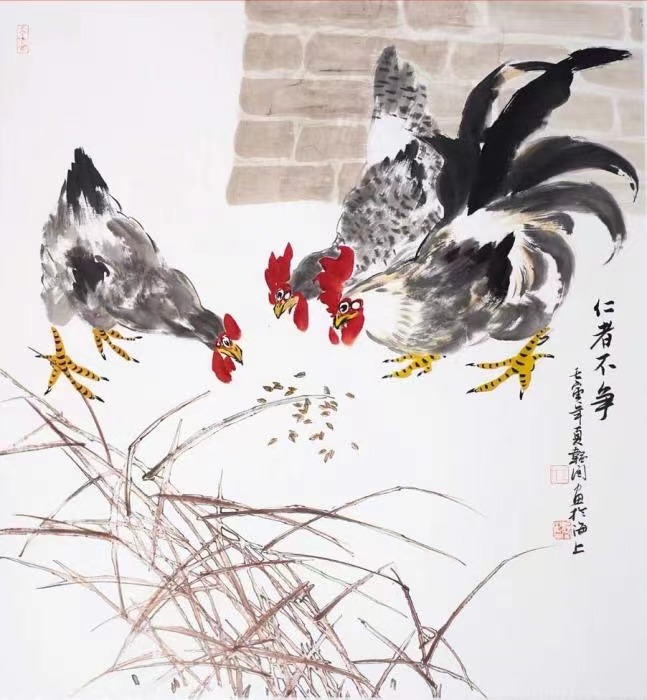 一幅幅生動(dòng)的畫作,一筆筆濃墨淡彩,一劃劃粗細(xì)有致的線條,以及整幅作品所展現(xiàn)出的意境和心境,性格和心態(tài),品質(zhì)與思維,躍然紙上。除了思想上的震撼,更有記憶深處的共鳴。這些作品幾乎囊括了農(nóng)村幾乎能見到的所有家養(yǎng)雞!無比傳神!這不就是記憶中故鄉(xiāng)的村巷里到處奔走覓食的散養(yǎng)雞嘛!即使村里不識(shí)字的村婦,看到之后也必然會(huì)引發(fā)共鳴:這就是農(nóng)村生活中最尋常的物什!這不僅僅是生活,更是鄉(xiāng)愁,是萬民的生計(jì),是大批鄉(xiāng)村的生態(tài)、精神以及割舍不斷的鄉(xiāng)愁!