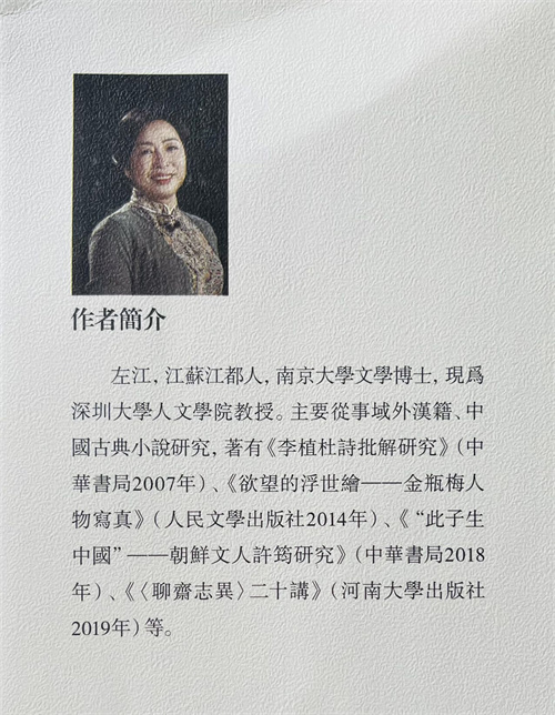 左江,南京大學(xué)古代文學(xué)博士,深圳大學(xué)人文學(xué)院教授、東亞漢籍研究所所長(zhǎng),長(zhǎng)期從事域外漢籍及中國(guó)古典小說(shuō)研究。主持建設(shè)《品讀聊齋》(國(guó)家級(jí)線上一流本科課程)、《金瓶梅人物寫真》(廣東省線上一流本科課程)、《中國(guó)古代文學(xué)導(dǎo)論》(深圳大學(xué)研究生“金課”)等多門優(yōu)質(zhì)課程。發(fā)表論文數(shù)十篇,出版著作有《李植杜詩(shī)批解研究》《欲望的浮世繪——金瓶梅人物寫真》《“此子生中國(guó)”——朝鮮文人許筠研究》《〈聊齋志異〉二十講》《高麗朝鮮時(shí)代杜甫評(píng)論資料匯編》《杜詩(shī)與朝鮮時(shí)代漢文學(xué)》等。其中《高麗朝鮮時(shí)代杜甫評(píng)論資料匯編》獲深圳市哲學(xué)社會(huì)科學(xué)優(yōu)秀成果獎(jiǎng)。