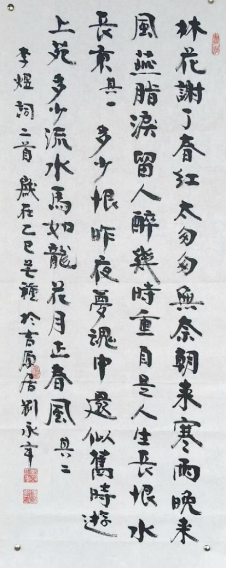 劉永年與書法的緣分,早已融入 “書法世家” 的血脈傳承中。童年時,在家族嚴教與墨香熏陶下,他便對橫平豎直的漢字生出天然的親近 —— 握筆的姿勢、運筆的力度、結(jié)構(gòu)的排布,那些刻在記憶里的書法啟蒙,成為他日后重拾筆墨的 “初心伏筆”。早年雖投身電力領(lǐng)域,專注于專業(yè)學(xué)習(xí)與工作,卻始終將對書法的熱愛藏于心底:或許是工作間隙偶見的碑帖,或許是街頭巷尾的匾額題字,都能勾起他對筆墨的向往。這份 “藏于歲月” 的熱愛,在他晚年歇業(yè)后終于得以釋放 —— 他重新執(zhí)筆,以 “初學(xué)者” 的謙遜與 “世家子” 的功底,一頭扎進書法的世界:臨摹楷書,他沉醉于顏筋柳骨的規(guī)整風(fēng)骨;研習(xí)行書,他體悟王羲之《蘭亭序》的靈動氣韻;探索隸書,他品味蠶頭燕尾的古樸韻味。更難得的是,他不滿足于單純的 “模仿”,而是嘗試將 “蘭竹之韻” 融入書法 —— 觀察蘭葉的舒展、竹桿的挺拔,將這份自然的靈動轉(zhuǎn)化為筆墨的節(jié)奏,讓書法作品既有法度的嚴謹,又有草木的生機,逐漸形成 “剛?cè)岵⒀潘坠操p” 的個人風(fēng)格。