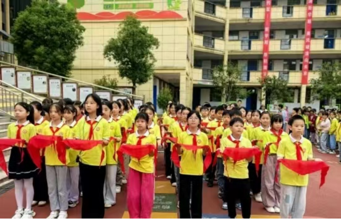 六年級少先隊員代表以一種莊重而神圣的姿態(tài),緩緩地為新隊員們佩戴上了鮮艷的紅領巾。他們的動作輕柔而堅定,每一道褶皺都仿佛在訴說著歷史的傳承與責任的接力。