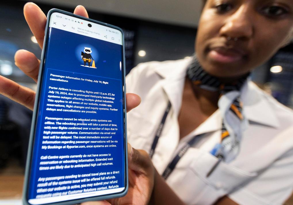 7月19日,在加拿大多倫多比利·畢曉普機(jī)場,一名波特航空公司的工作人員用手機(jī)顯示因技術(shù)故障取消航班的網(wǎng)絡(luò)通知。新華社發(fā)(鄒崢攝)