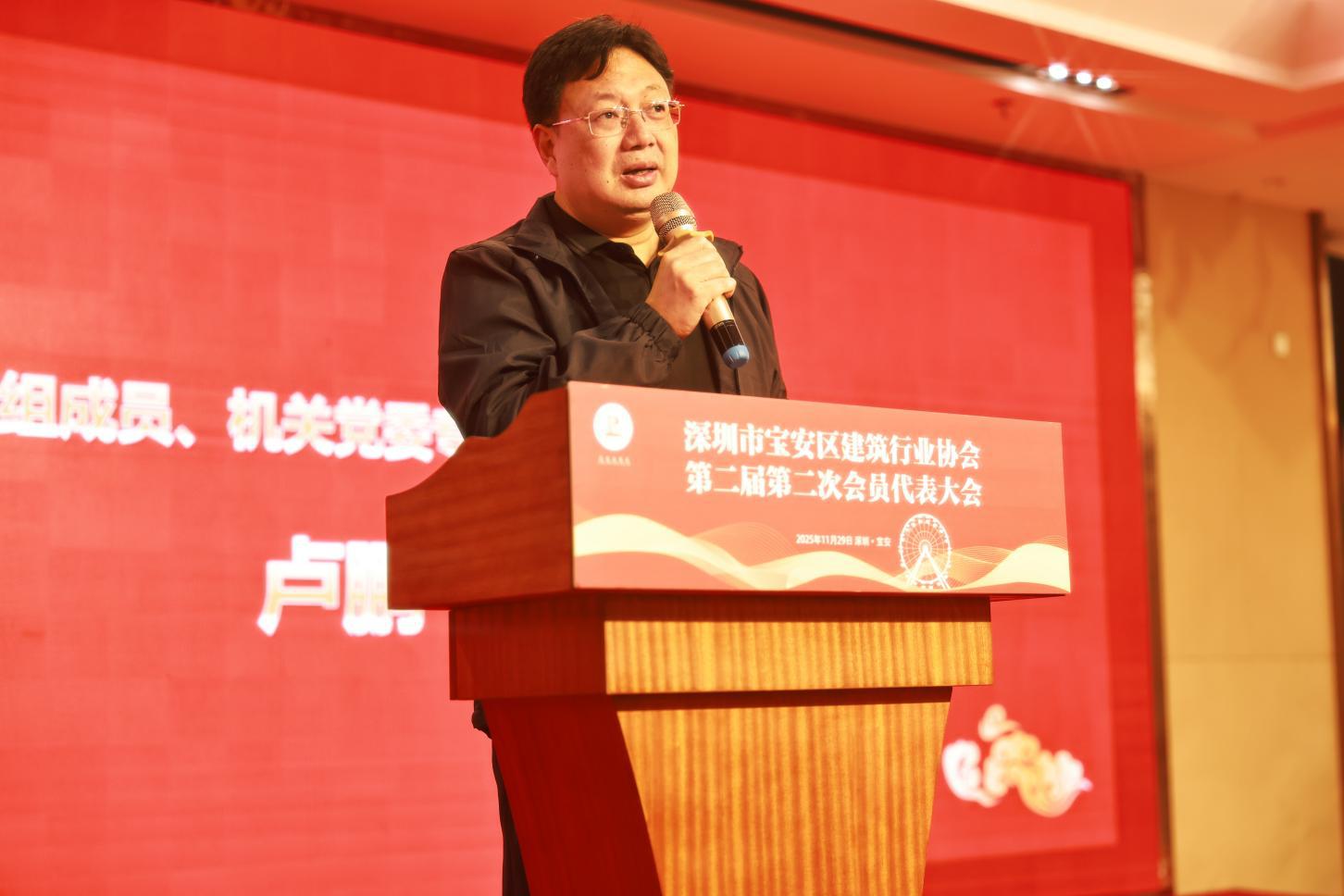 2025年11月29日,深圳市寶安區(qū)建筑行業(yè)協(xié)會第二屆第二次會員代表大會在西鄉(xiāng)街道寶悅酒店二樓多功能廳順利召開。寶安區(qū)住房和建設(shè)局黨組成員、機(jī)關(guān)黨委專職副書記、紀(jì)委書記、二級調(diào)研員盧鵬飛同志,寶安區(qū)社會組織黨委副書記錢東升同志及其他相關(guān)部門領(lǐng)導(dǎo)、會員代表、邀請嘉賓出席會議。
