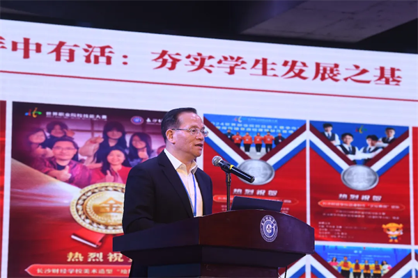 長沙財(cái)經(jīng)學(xué)校校長伍卓林致歡迎辭,并圍繞“讓人人自信出彩”的主題,從管理體系、教學(xué)改革、資源整合等方面分享了學(xué)校對口升學(xué)管理的典型經(jīng)驗(yàn)。