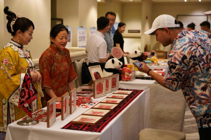 精美文創(chuàng)、面食表演、非遺文化……活動(dòng)現(xiàn)場,山西非遺文創(chuàng)品展臺(tái)上擺滿了各色精美的展品,在非遺互動(dòng)區(qū)域,山西面食表演、剪紙?bào)w驗(yàn)和推光漆器展示吸引了眾多美國友人的熱情參與。正式活動(dòng)環(huán)節(jié)中,山西文旅推介官對(duì)山西的冰雪主題文旅資源進(jìn)行了精彩推介。山西非遺傳承人王張龍現(xiàn)場展示了扯面、拉面、刀削面及吹面氣球等精湛技藝,贏得了現(xiàn)場觀眾的陣陣掌聲。