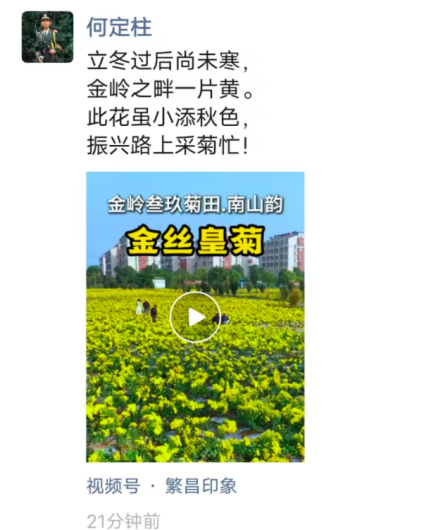 《中華英才》半月刊網(wǎng)安徽訊(俞乃思) 立冬雖過,暖陽依舊。安徽省蕪湖市繁昌區(qū)孫村鎮(zhèn)黨委書記何定柱在獲悉本鎮(zhèn)金嶺社區(qū)40畝金絲皇菊喜獲豐收、綻放成“致富花”的消息后,心潮澎湃,凝神片刻,欣然提筆賦詩一首,分享至朋友圈,以詩抒懷,以文銘志,傳遞出鄉(xiāng)村振興路上的熾熱情懷與堅(jiān)定信心。