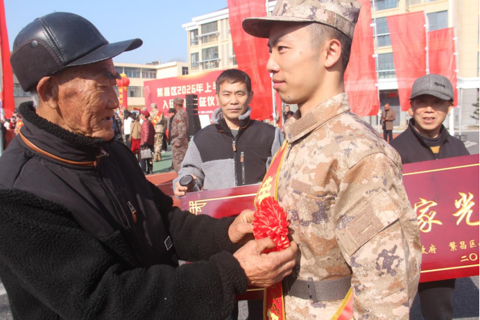 俞時金老人站在新兵隊伍旁,伸手輕輕撫摸著孫子俞淏胸前的大紅花。老人是九連村九連麒麟燈會的省級非遺傳承人,平時熱心公益,為家鄉(xiāng)鄉(xiāng)村振興出了不少力。今天,他的身份是送孫參軍的爺爺。隊伍即將出發(fā),老人沒多說,只是拍了拍孫子的肩膀。俞淏挺直腰板,朝爺爺點點頭。這一送,是把自家的孩子交給國家。