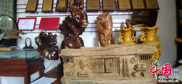 “父親是一名小學(xué)美術(shù)教師,他有空經(jīng)常教我畫畫,因此我從小就對雕刻產(chǎn)生了濃厚興趣,2000年我到廣東佛山打工,經(jīng)常跑到工地附近一家根雕館去看去學(xué),后來我干脆去根雕館打工當(dāng)學(xué)徒,2年后我返回家鄉(xiāng)創(chuàng)辦興華根藝工作室,開始根雕創(chuàng)作……”劉龍興說。