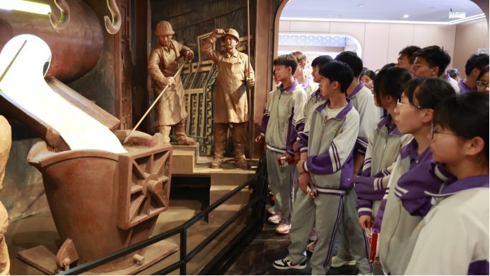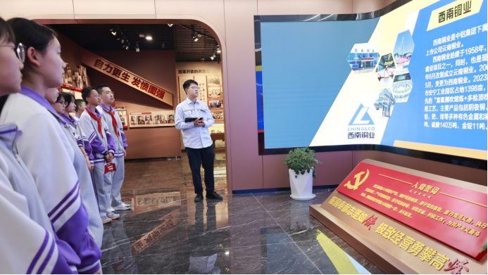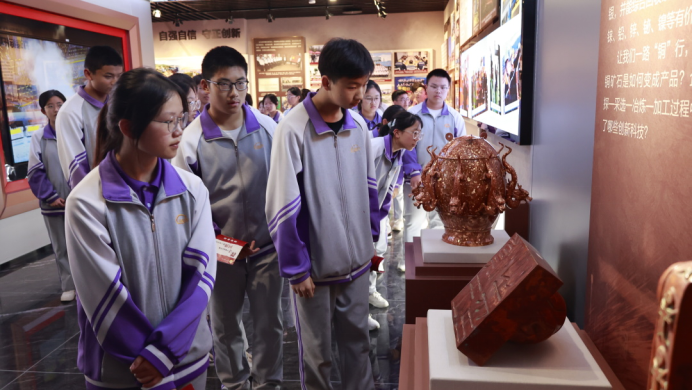 第三站來到西南銅業(yè)集團展廳,同學們跟隨講解員的步伐,探尋著冶煉技術從古至今的發(fā)展歷程,同學們認真觀察著琳瑯滿目的金屬制品,用學科知識探討著所見所感,樂在其中。