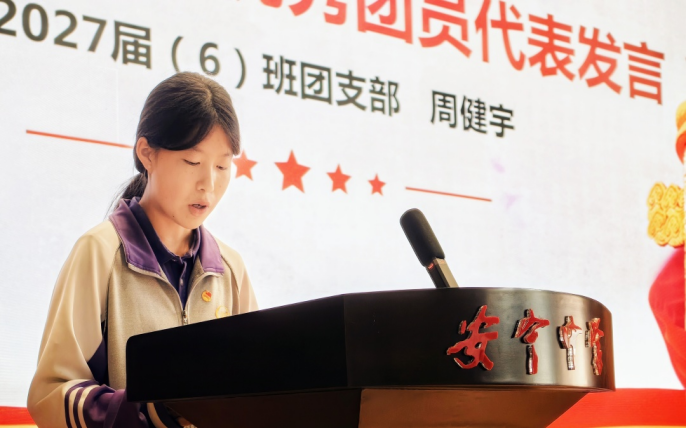 來自初2025屆(4)班團支部的張峻銘同學(xué)作為新團員代表發(fā)言,他激動地分享道:“當(dāng)團徽別上胸口,入團誓詞回響耳畔,我深刻意識到,自己正式肩負起了時代賦予青年的使命。作為新時代的中學(xué)生,我們生逢盛世,更應(yīng)賡續(xù)紅色血脈,傳承五四精神,讓青春在不懈奮斗中綻放絢麗之花。”