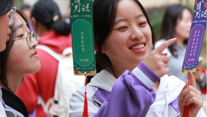 安寧中學(xué)高中部的中秋聯(lián)歡在一場(chǎng)趣味盎然的頭腦風(fēng)暴中拉開(kāi)帷幕——兩人一組,合作完成“看emoji猜燈謎”。謎面既有“不知天上宮闕,今夕是何年”的詩(shī)意,也有“吳剛伐桂”等典故。抽象的圖畫(huà)搭配巧妙的諧音梗,既激發(fā)想象力,又考驗(yàn)反應(yīng)力,各組踴躍競(jìng)猜,現(xiàn)場(chǎng)氣氛熱烈非凡。