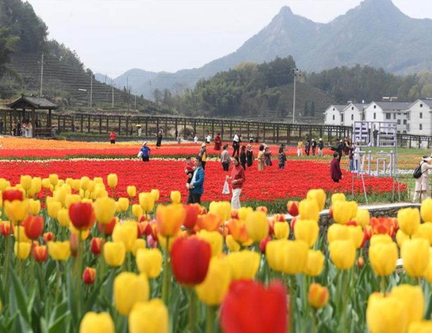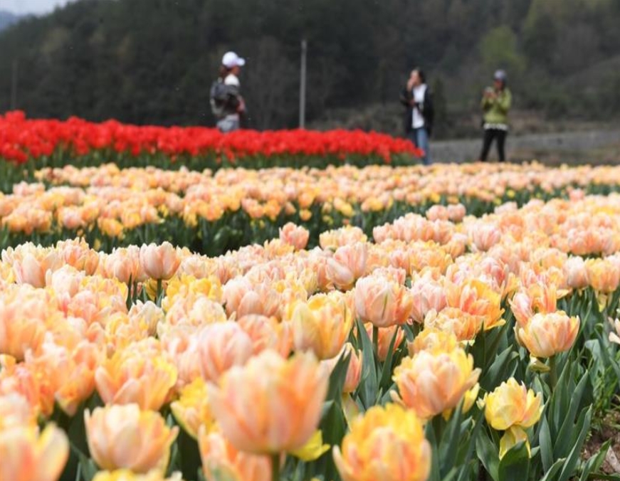 3月28日,游客在烏漿村鮮花基地觀賞郁金香。新華社記者翁忻旸 攝