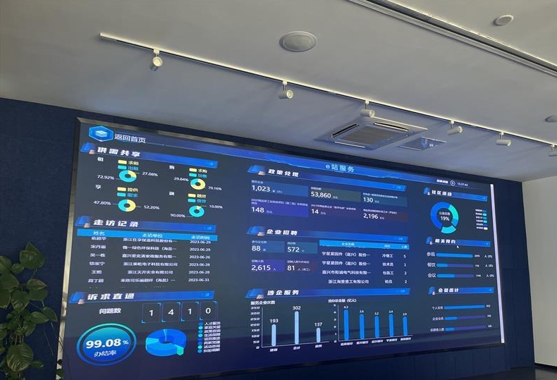 在海鹽經(jīng)濟(jì)開發(fā)區(qū)(西塘橋街道)智匯灣工業(yè)社區(qū)的顯示屏上,可以看到登錄著的“未來工業(yè)社區(qū)e站通——智企連”應(yīng)用平臺上正滾動著多家企業(yè)的招聘信息。為更好地服務(wù)轄區(qū)企業(yè),2021年海鹽經(jīng)濟(jì)開發(fā)區(qū)(西塘橋街道)智匯灣工業(yè)社區(qū)運(yùn)用數(shù)字化技術(shù),開發(fā)建設(shè)了“未來工業(yè)社區(qū)e站通——智企連”應(yīng)用。